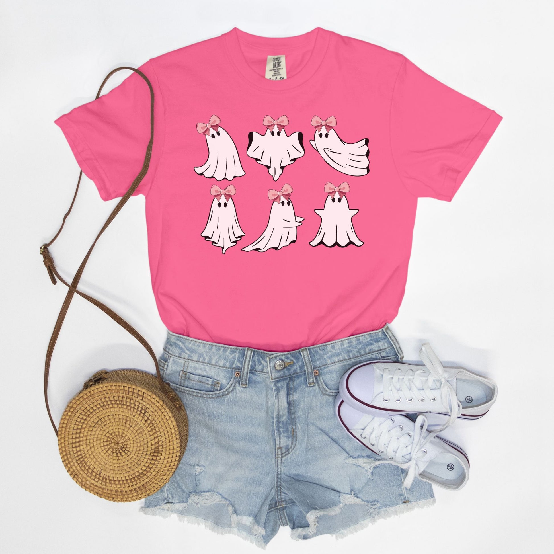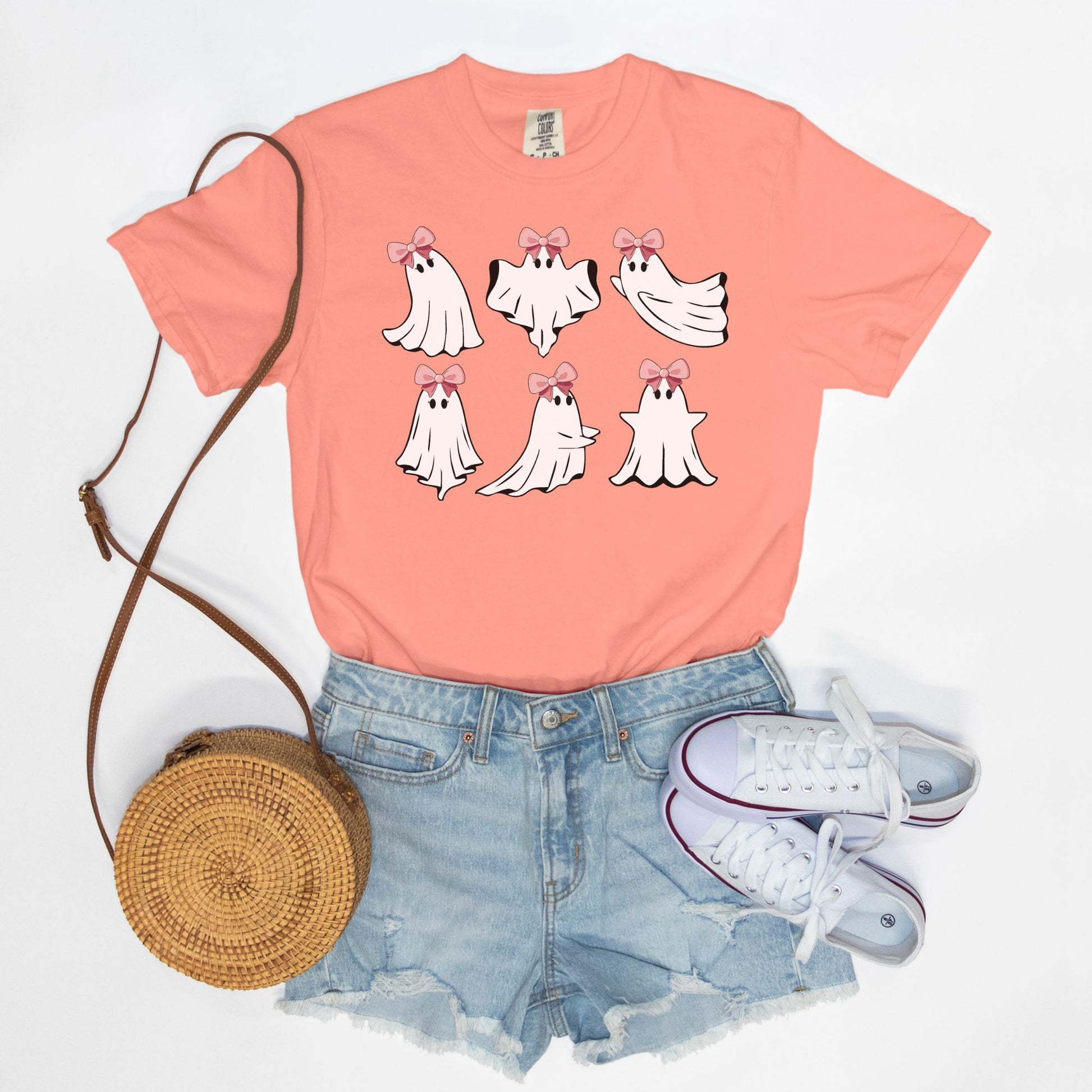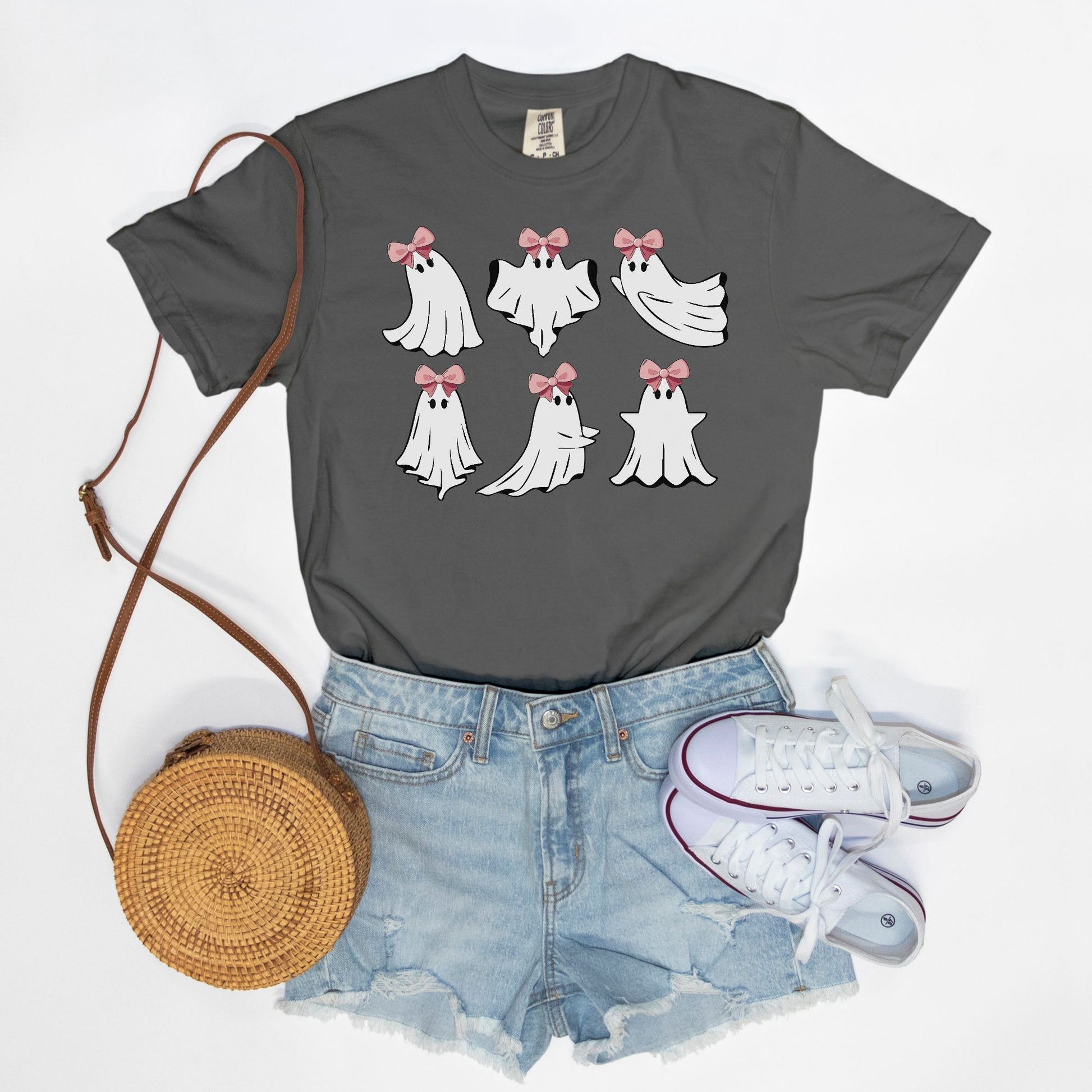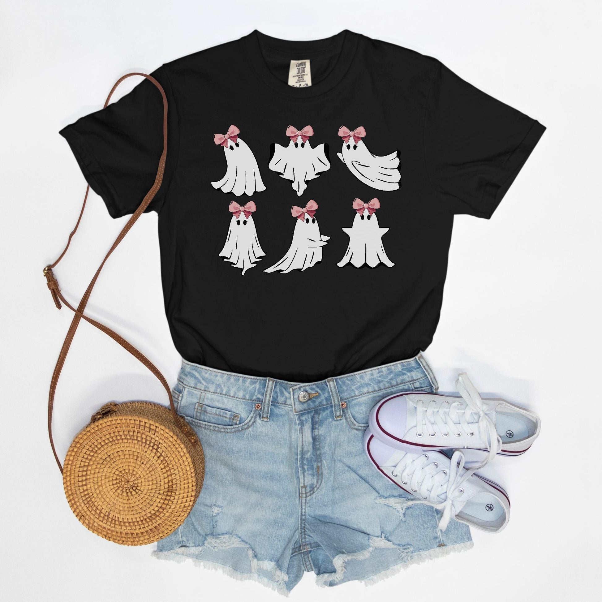 Embrace the spirit of Halloween with the Ghosts With Bows Crewneck. This playful tee features charming girly ghosts adorned with cute bows, perfect for adding a whimsical touch to your festive wardrobe. Available in classic Black, soft Blossom, modern Pepper, and crisp White, it suits all styles. Make a statement this Halloween with a fun design that captures the festive spirit while keeping you cozy and stylish.