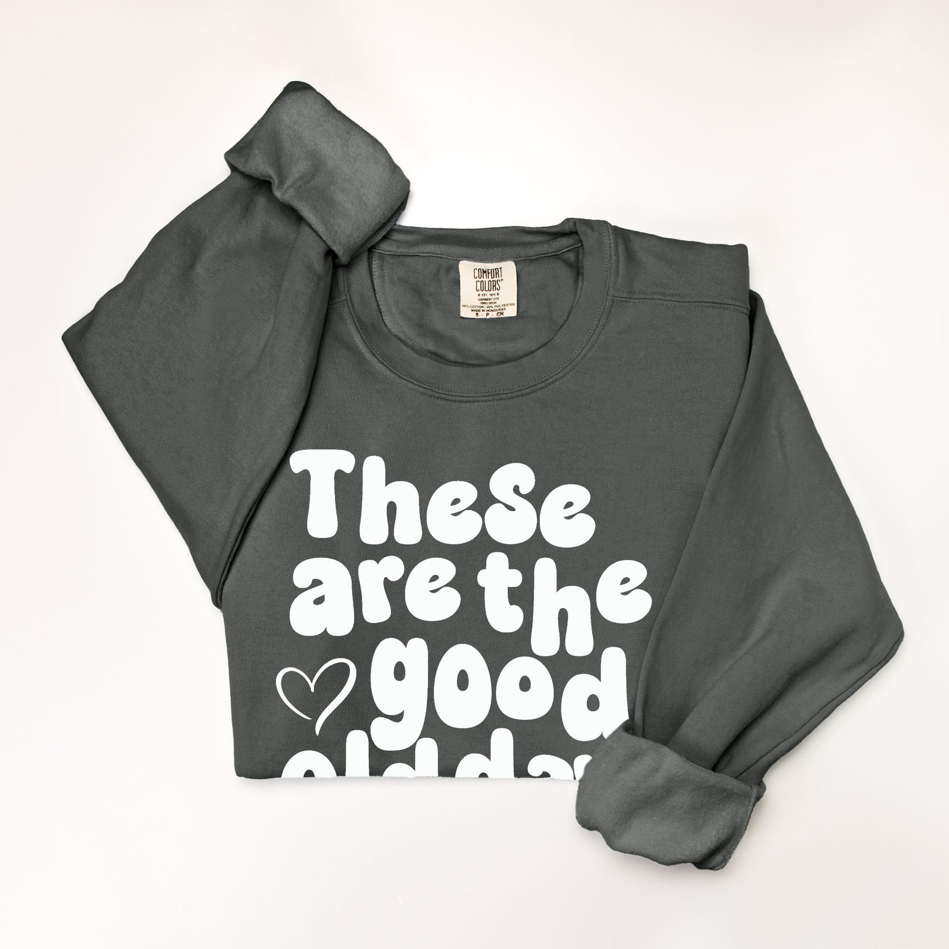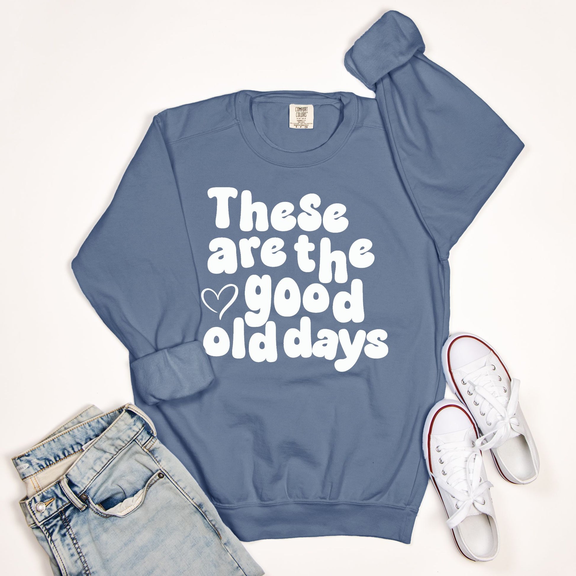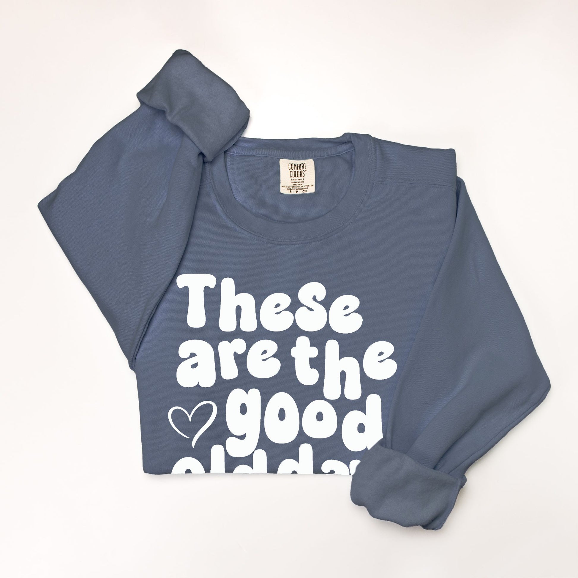 Wrap yourself in nostalgia with our "These Are The Good Old Days" Crewneck. Available in a warm Blue Jean, soft Orchid, and classic Pepper, this sweatshirt evokes cherished memories of simpler times. Each stitch whispers stories of laughter and carefree days, making it a perfect addition to your wardrobe. Reconnect with your favorite moments in timeless comfort.