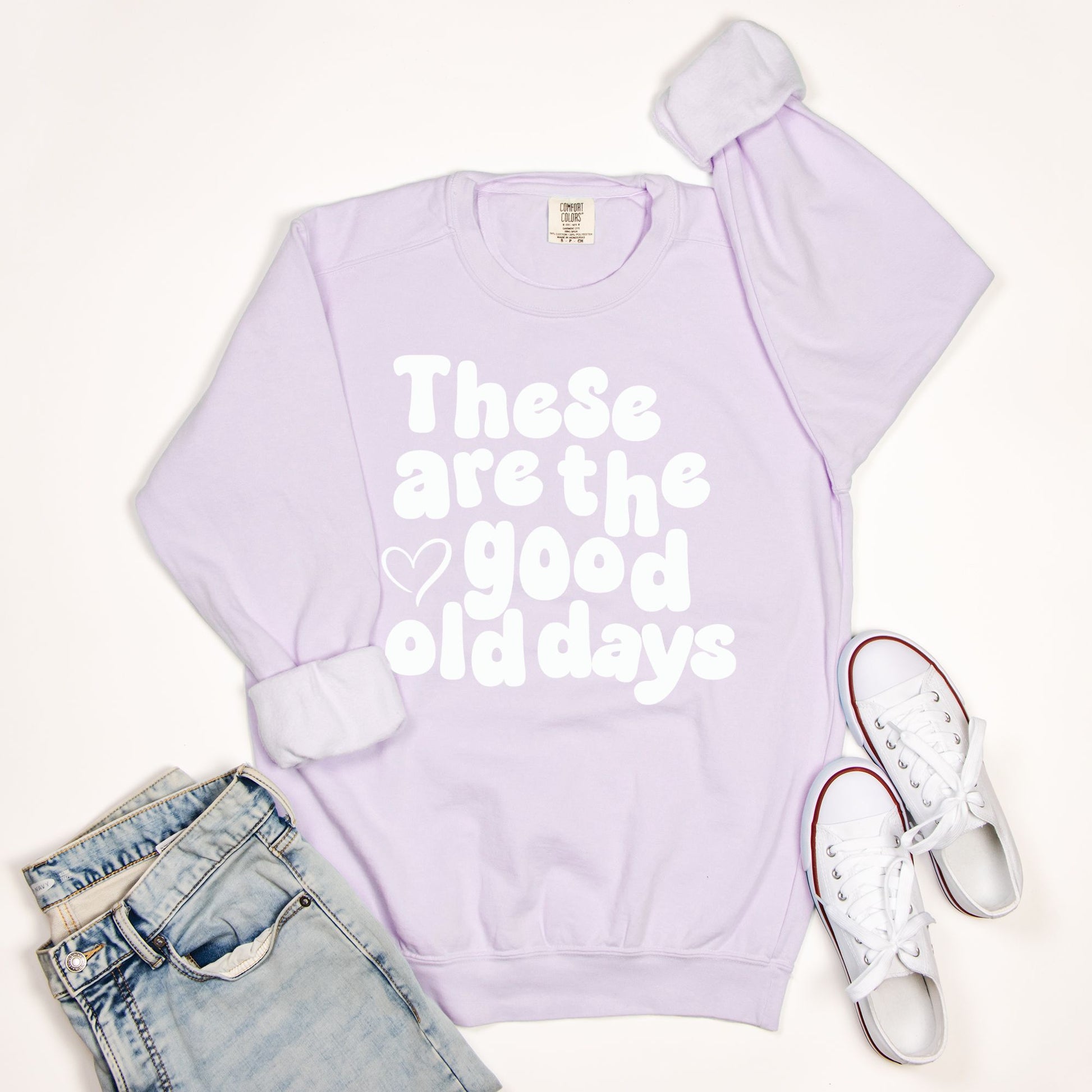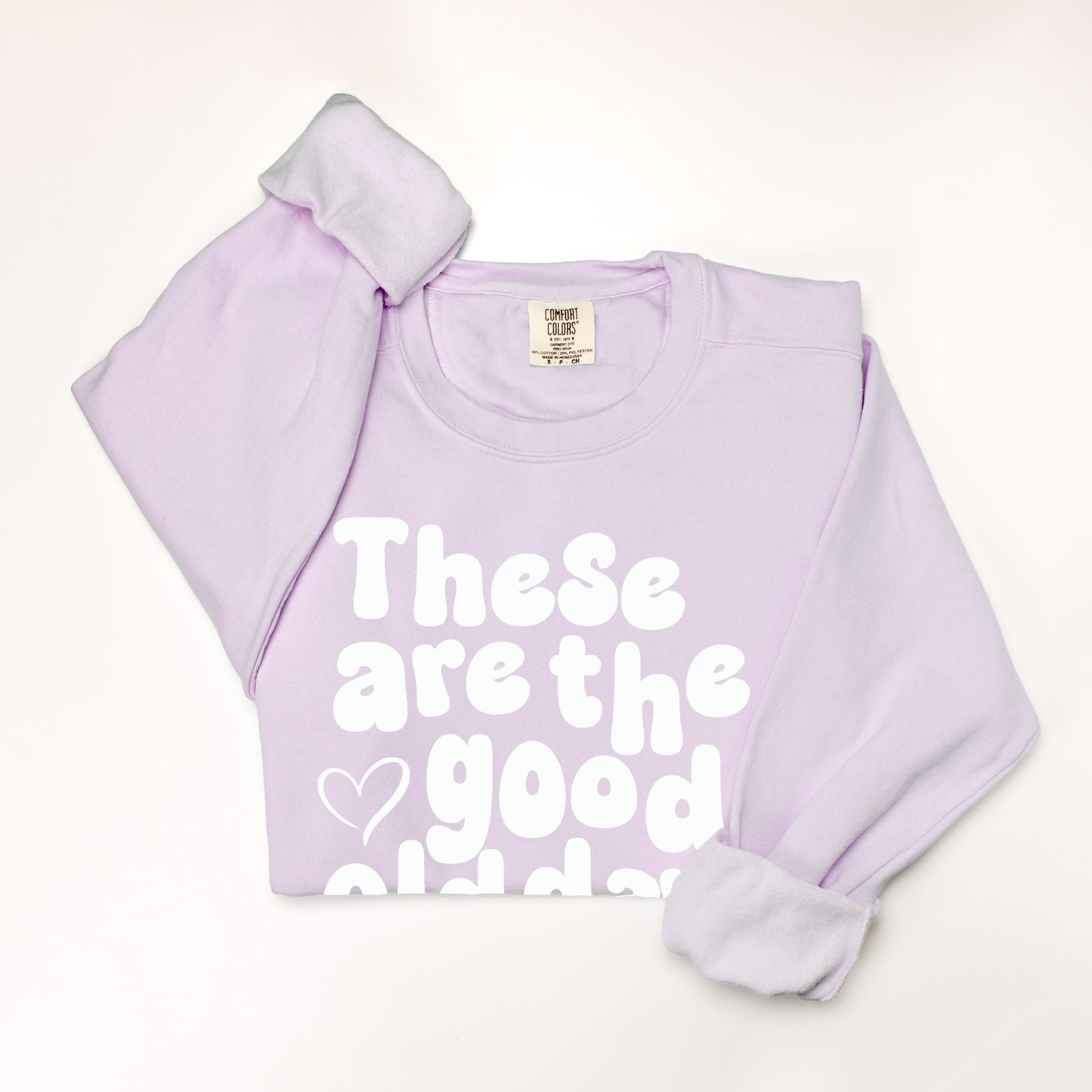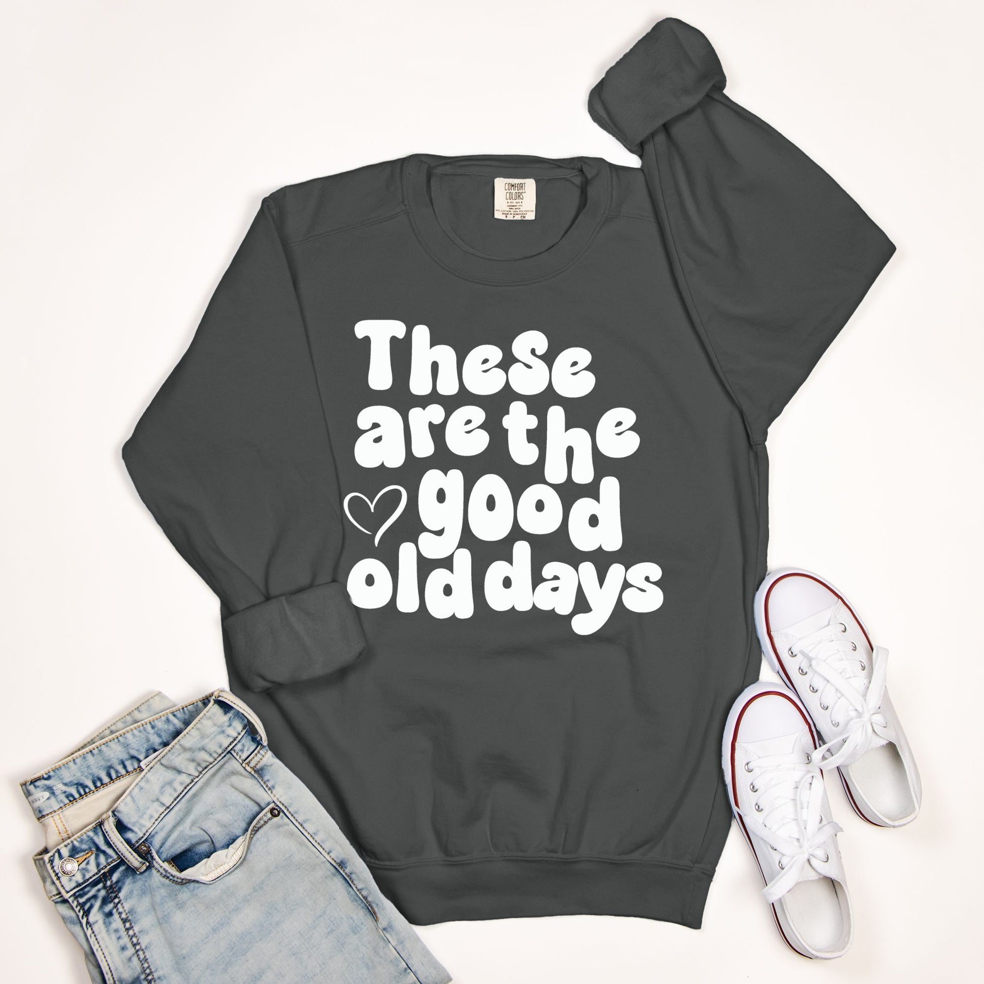 Wrap yourself in nostalgia with our "These Are The Good Old Days" Crewneck. Available in a warm Blue Jean, soft Orchid, and classic Pepper, this sweatshirt evokes cherished memories of simpler times. Each stitch whispers stories of laughter and carefree days, making it a perfect addition to your wardrobe. Reconnect with your favorite moments in timeless comfort.